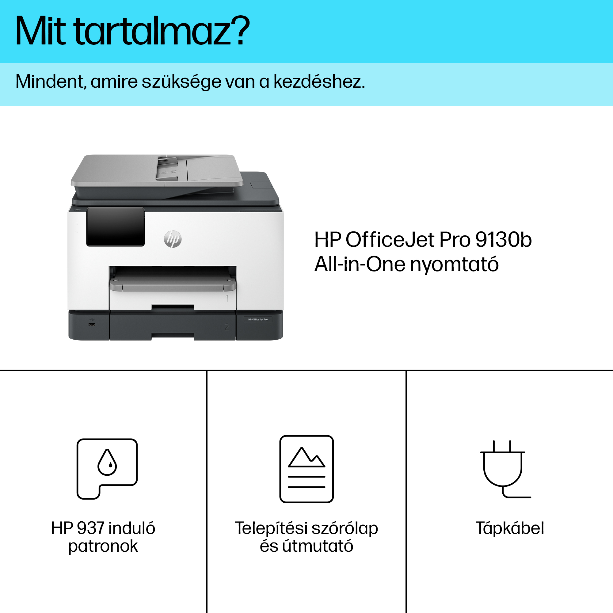 | Doboz tartalma | NA: HP OfficeJet Pro 9130b AiO Printer; HP 936 Setup Black Ink Cartridge; HP 936 Setup Cyan Ink Cartridge; HP 936 Setup Magenta Ink Cartridge; HP 936 Setup Yellow Ink Cartridge; Regulatory Flyer; Ink Caution Flyer; Power Cord; Setup Poster; Reference Guide [For more information about fill and yield, see http://www.hp.com/go/learnaboutsupplies ]; EU / AP Developed Market: HP OfficeJet Pro 9130b AiO Printer; HP 937 Setup Black Ink Cartridge; HP 937 Setup Cyan Ink Cartridge; HP 937 Setup Magenta Ink Cartridge; HP 937 Setup Yellow Ink Cartridge; Regulatory Flyer; Ink Caution Flyer; Power Cord; Setup Poster; Reference Guide [For more information about fill and yield, see http://www.hp.com/go/learnaboutsupplies ]; LAR / AP Emerging Market: HP OfficeJet Pro 9130b AiO Printer; HP 938 Setup Black Ink Cartridge; HP 938 Setup Cyan Ink Cartridge; HP 938 Setup Magenta Ink Cartridge; HP 938 Setup Yellow Ink Cartridge; Regulatory Flyer; Ink Caution Flyer; Power Cord; Setup Poster; Reference Guide [For more information about fill and yield, see http://www.hp.com/go/learnaboutsupplies ] |